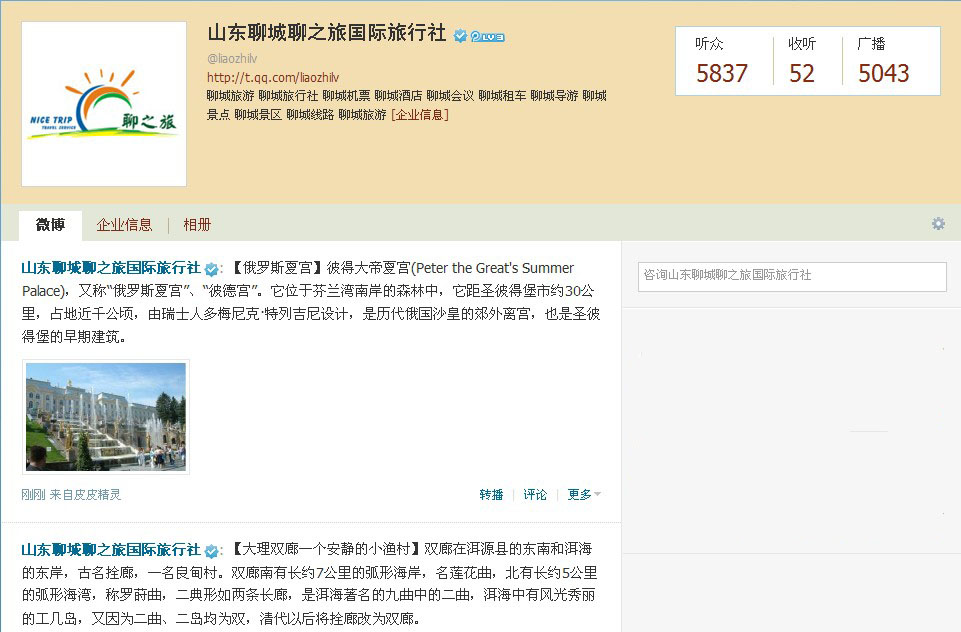 聊之旅國(guó)際旅行社騰訊官方微博:http://t.qq.com/liaozhilv聽眾突破5000人