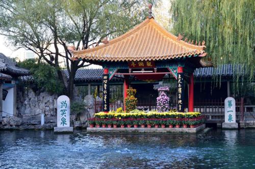 請大家跟我來。趵突泉公園位于濟(jì)南市中心,南靠千佛山,東臨泉城廣場,北望大明湖,面積近11萬平方米。趵突泉公園是一座以泉水為主的自然山水公園,其內(nèi)趵突泉又名檻(jian,kan)泉,為濼(luo)水之源,是濟(jì)南七十二名泉之冠,被譽(yù)為“天下第一泉”,至今已有2700年的歷史,水溫一年四季恒定在攝氏18度左右。趵突泉公園以觀泉、賞魚、品茶、山石文化為特色,以小巧玲瓏、步移景異、清潔幽靜、古樸典雅而著稱。