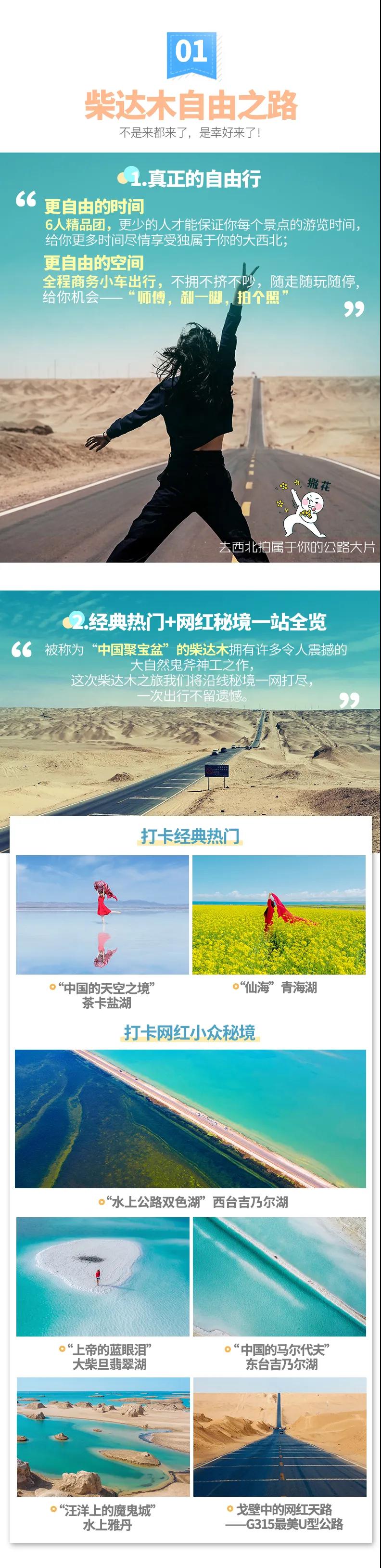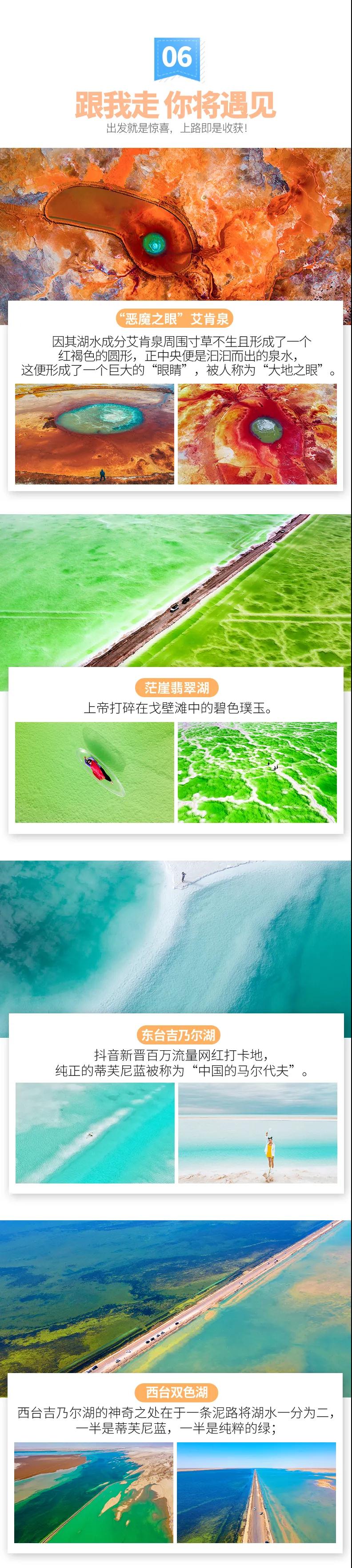 (5)茫崖翡翠湖、東/西臺吉乃爾湖、艾肯泉為小眾未開發(fā)景點(diǎn),往年不設(shè)門票,若今年收費(fèi)門票或環(huán)保費(fèi)由游客自理。