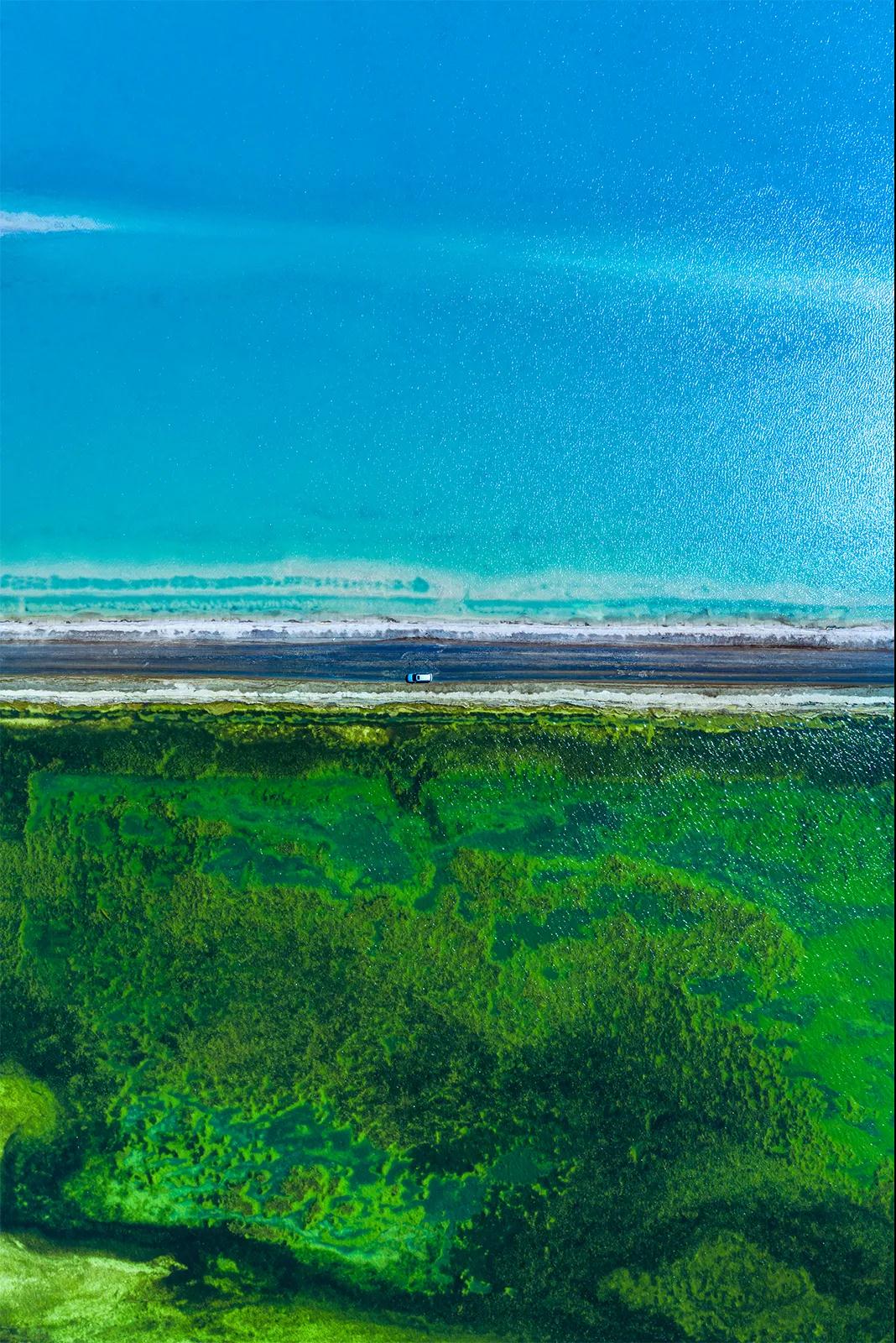 我們先抵達(dá)【西臺雙色湖】,西臺吉乃爾湖的神奇之處在于一條泥路將湖水一分為二,一半是蒂芙尼藍(lán),一半是純粹的綠;左邊碧綠如玉的是淡水湖,右邊瓦藍(lán)如天的是鹽水湖,雖然他是鹽湖,但是它那獨(dú)有的特色在中國也能領(lǐng)略到堪比馬爾代夫的亮點(diǎn),顛覆了你對任何湖的想象。最重要一點(diǎn)是這里還是一個未被開發(fā)的超小眾地方,沒有摩肩擦踵,才有更好的風(fēng)景。