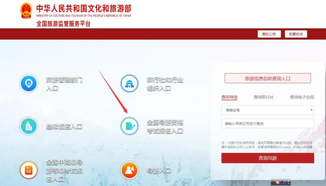 (進入“全國旅游監(jiān)督服務平臺”,選擇“全國導游資格考試報考入口”入口登錄)