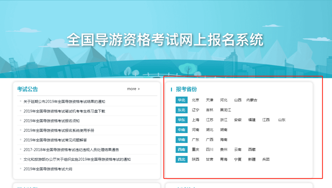 一、進入該網站,點擊【全國導游資格考試報考入口】,選擇【所在省份】進入