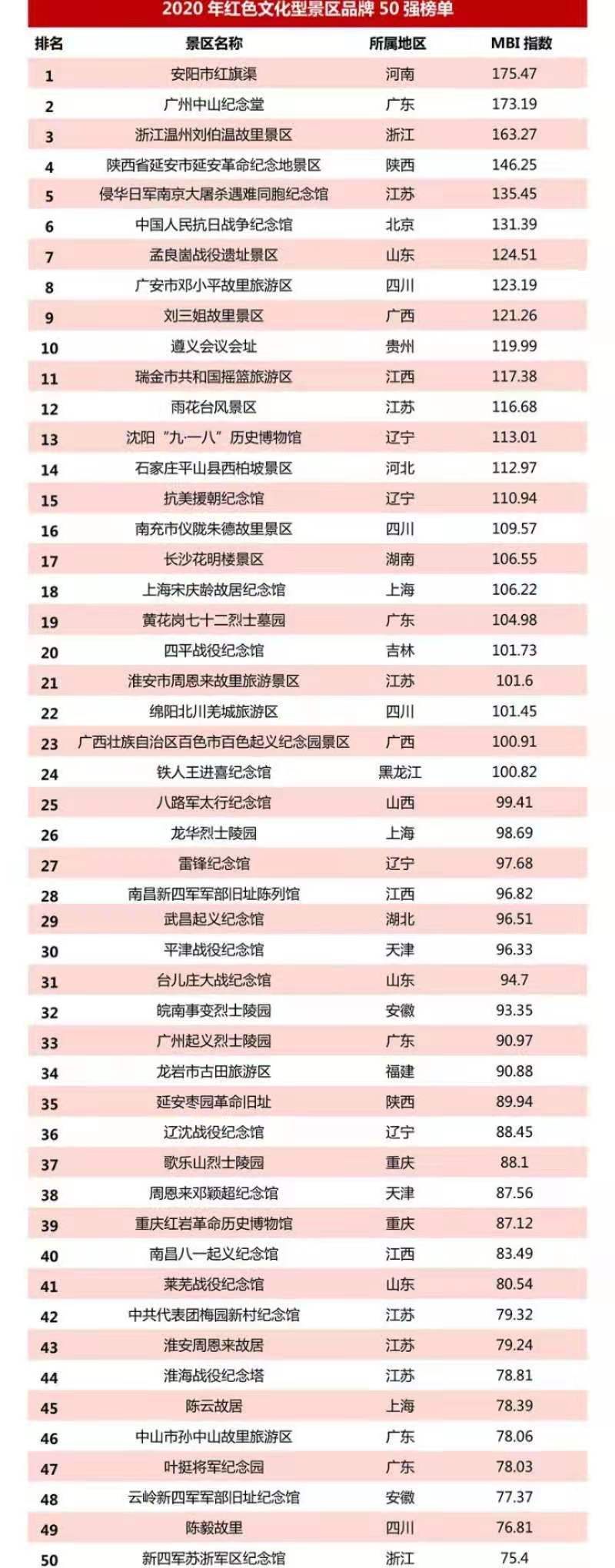 以下是「我們」獨家發(fā)布的“2020年紅色文化型景區(qū)品牌50強榜單”,其中安陽市紅旗渠、廣州中山紀念堂、浙江溫州劉伯溫故里景區(qū)位列年度三甲。