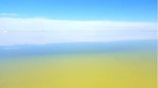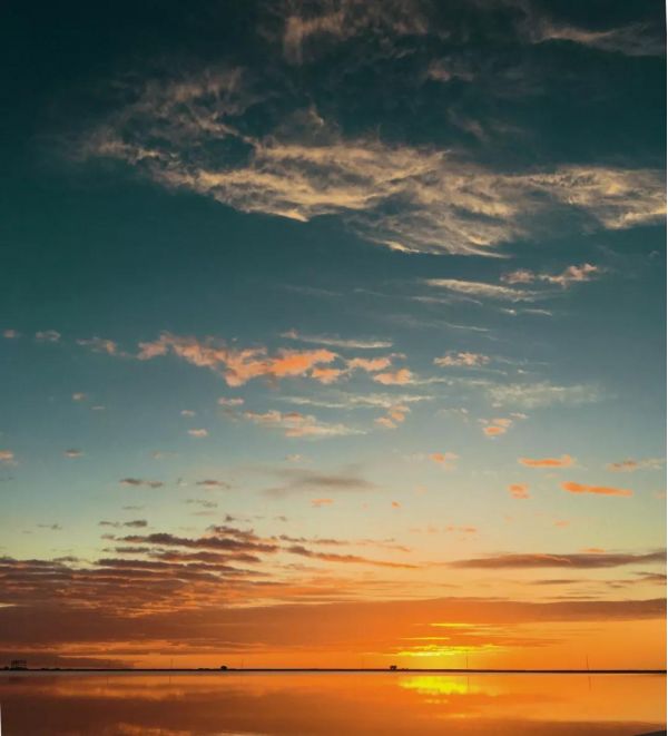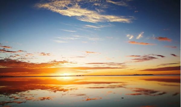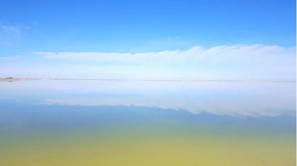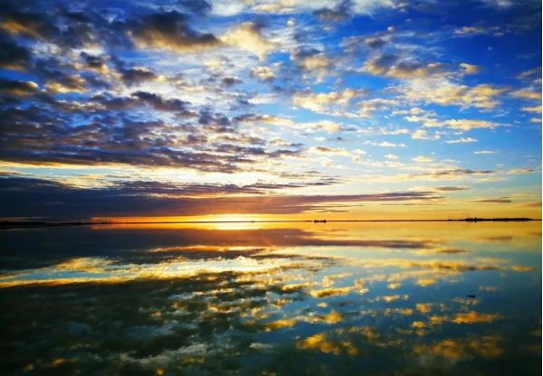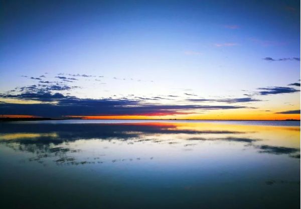平靜的湖面,水天一色,遠(yuǎn)處的白云像是海水的浪花,一層層逐漸向你涌來。
