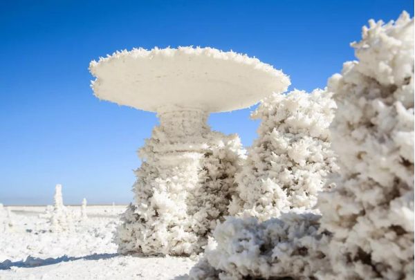 這些鹽花無需人工的雕琢,形態(tài)各異,有的宛如貝殼,有的宛如樓臺,一叢叢,一片片,一簇簇地立于鹽湖中,把鹽湖裝飾得如仙境一般。