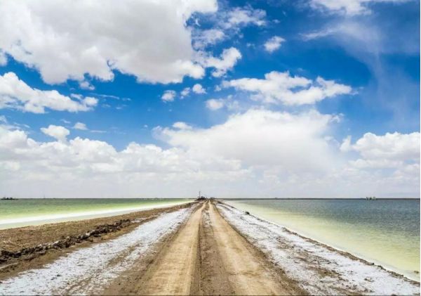除了美麗的風(fēng)景外,察爾汗鹽湖還有32公里的青藏鐵路的路基和一條全用鹽鋪造的、橫跨鹽湖的公路——敦格公路,當(dāng)?shù)厝朔Q之為“萬丈鹽橋”。
