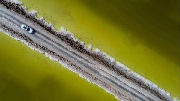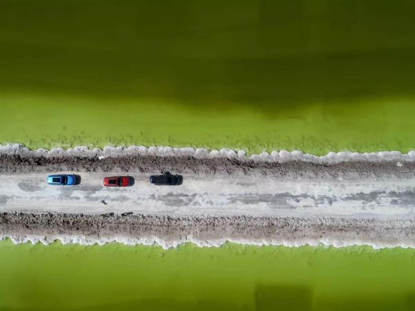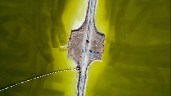 這座“鹽橋”,旁無護(hù)欄,下無橋墩,也無流水,從空中看,就像是直接橫叉在湖面上,它將鹽湖從中間劈成兩半,似乎沿著這條路走下去,就能達(dá)到神仙的住所。