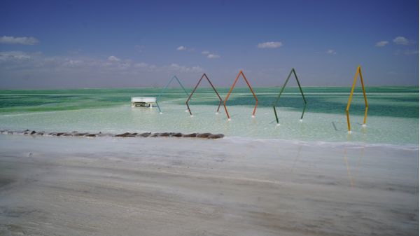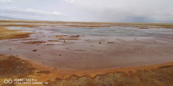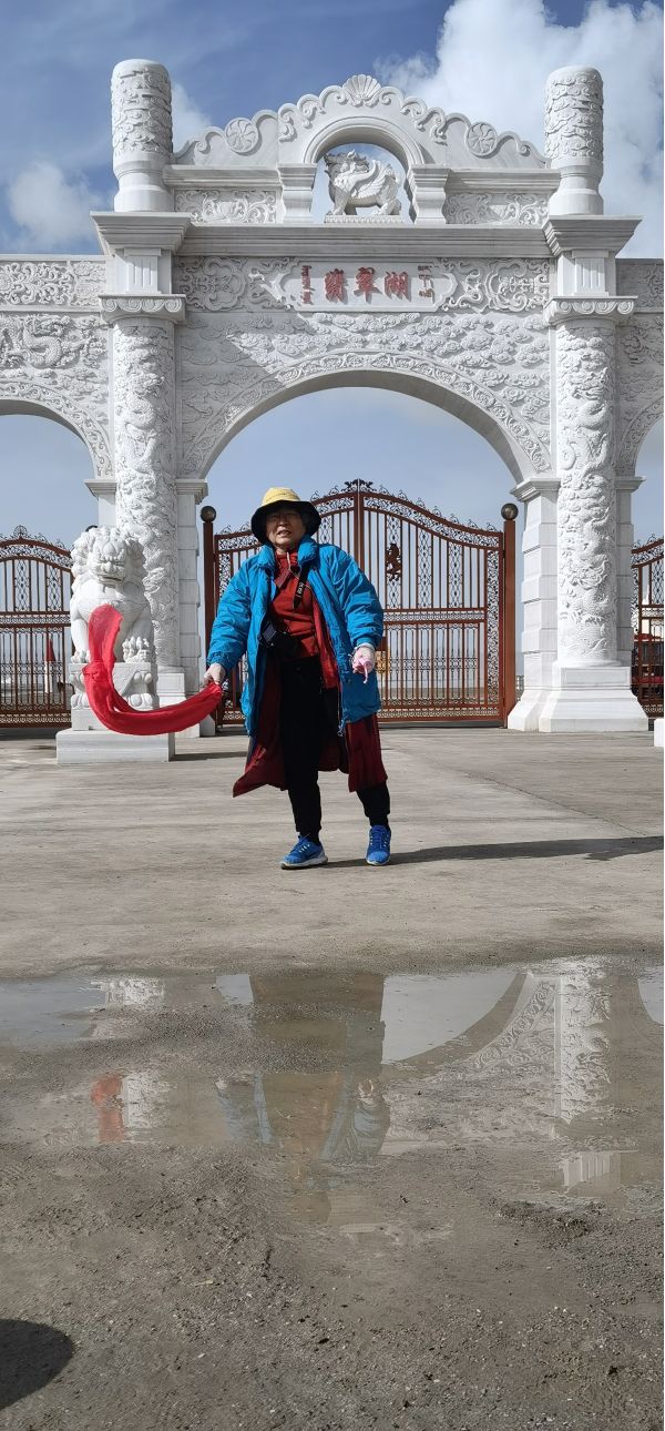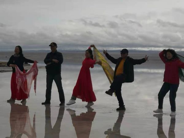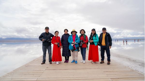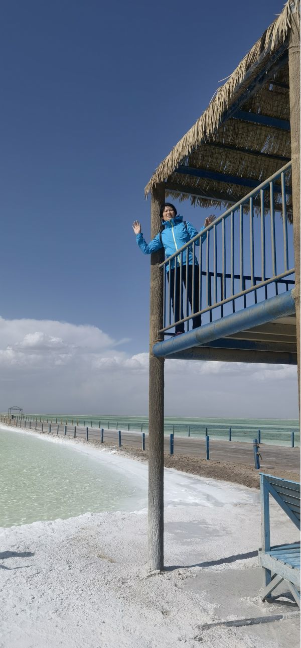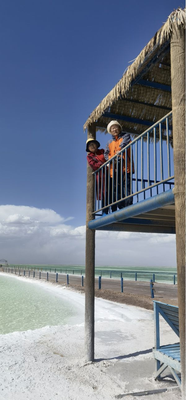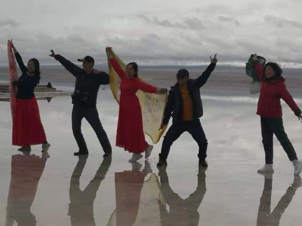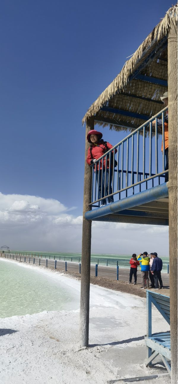 時(shí)速大約相當(dāng)于人的走路的兩倍到三倍,咣當(dāng)咣當(dāng)?shù)故遣坏⒄`欣賞一路風(fēng)景。目的地就是當(dāng)年鹽場(chǎng)采鹽的鐵路的盡頭。鹽水很淺,風(fēng)平浪靜,翠綠的鹵水倒影著遠(yuǎn)處的雪山,風(fēng)景剎是美麗,水也就是能沒到腳面,租他的膠鞋和紅色的裙子可以到鹽湖里面拍攝。紅色的裙子倒影非常漂亮,遠(yuǎn)處的云彩黑白相間。一朵一朵相擁而來,紅色的裙子,翠綠色的湖水,藍(lán)色的天空白色的雪山,真是如入仙境,大家操作無人機(jī)上下左右拍了無死角,兩個(gè)多小時(shí)瞬間過去,說好的是5點(diǎn)返程,6點(diǎn)了大家還意猶未盡,流連忘返。