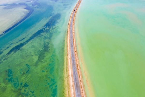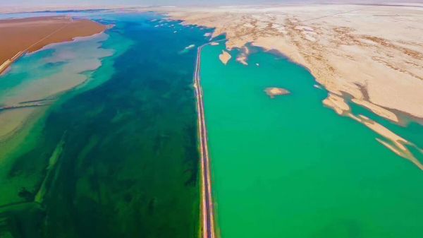 西臺(tái)吉乃爾湖俗稱“雙色湖”,此湖被G315國(guó)道從中穿過,將湖面分為兩半,一側(cè)湖水因富含銅離子而呈現(xiàn)淺綠色,一側(cè)湖水因含有硫酸亞鎂而呈深藍(lán)色,奇特又漂亮,被戲稱為“鴛鴦火鍋”。