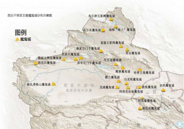 從地圖上我們可以明顯看到,北疆是魔鬼城的主要分布區(qū)域,甘肅、青海也有少量分布,實際上,在西北資料可查的雅丹地貌群就近百余處,它們一個個神秘地屹立在西北疆域上,成為了寂寞荒原上的一場視覺盛宴,數(shù)量之多,形態(tài)之多,就像是一個神秘而龐大的“魔鬼”家譜,實際上,它們并不是被人類遺棄或鬼神建造的“古城”,而是經(jīng)過風蝕形成的一種特有地貌景觀,用我的話講就是被風吹了多少年的一堆大土丘~可是深入其中,高高低低的“建筑群”投下錯亂光影,在這里幾乎看不到任何生命的跡象,因為鐵含量過高,磁場不穩(wěn)定, 指南針進入雅丹地貌經(jīng)常會不管用,尤其在夜深人靜,遇到風吹,聲音似鬼哭狼嚎,極其陰森恐怖,故被稱為“魔鬼城”。如果晚上在魔鬼城里露宿一夜,想必也會是一種奇妙的體驗~