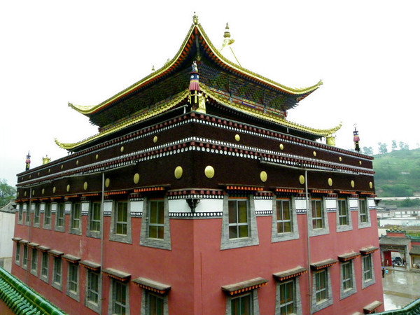 小金瓦寺藏語稱"旃康",是塔爾寺的護(hù)法竦睿?ㄓ諉鞒珈跛哪?1631)。殿分上下3層,底層和中層面闊七間,進(jìn)深五間。底層為三面封閉的殿堂,中層為明窗式,在藏式雙層平頂建筑上增建面闊三間的漢式歇山頂單檐建筑,清嘉慶七年(1802)改為鎏金銅瓦頂。殿內(nèi)有佛像、鎏金寶塔、經(jīng)卷、白馬標(biāo)本等。院內(nèi)兩側(cè)和前方有繪滿各式壁畫的壁畫廊,為兩層藏式建筑。