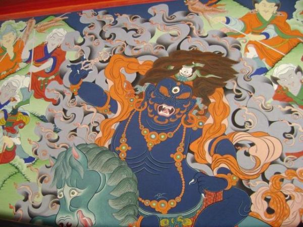 壁畫,是各個殿宇墻壁上繪畫,它大多繪于布幔上,也有的直接繪于墻壁和棟梁上。壁畫的染料采用天然石質(zhì)礦物,因此具有色澤鮮艷,經(jīng)久不變的特點(diǎn)。塔爾寺的壁畫屬喇嘛教畫派,因此具有濃厚的印、藏風(fēng)味。壁畫內(nèi)容,人物主次多屬密乘教義,畫面構(gòu)想巧妙,布署適然,色調(diào)和諧,工藝精湛,手法細(xì)膩。