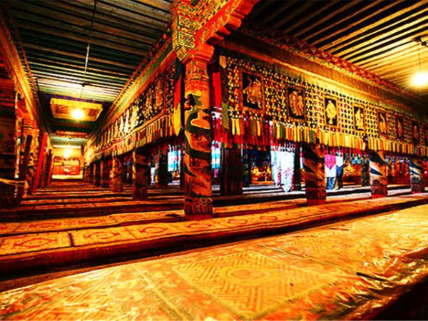 大經(jīng)堂始建于明萬歷三十四年(1606),毀于火,1917年重建。土木結(jié)構(gòu),為藏式雙層平頂建筑,漢式樓閣遙相互映。經(jīng)堂面闊十三間,進(jìn)深十一間。面積1981平方米。堂內(nèi)四壁存放著數(shù)百冊經(jīng)卷。
