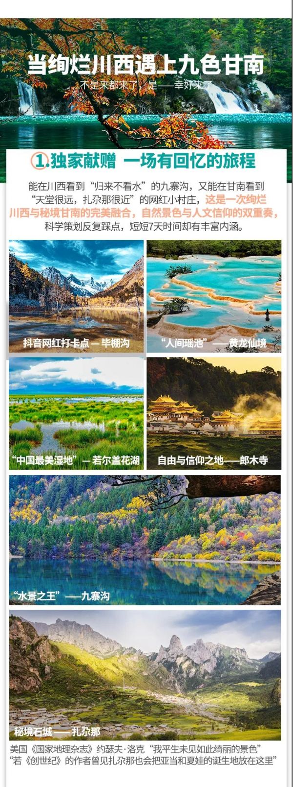 4、九寨溝景區(qū)實(shí)行分區(qū)域開(kāi)放,開(kāi)放區(qū)域?yàn)闇峡诮?jīng)諾日朗瀑布至長(zhǎng)海,扎如溝的扎如寺及日則溝的鏡海;其中,長(zhǎng)海、五彩池、鏡海、諾日朗瀑布、樹(shù)正群海、雙龍海瀑布、扎如寺等景觀原則上為步行游覽區(qū),具體游覽方式請(qǐng)聽(tīng)從隨車(chē)講解員安排;
