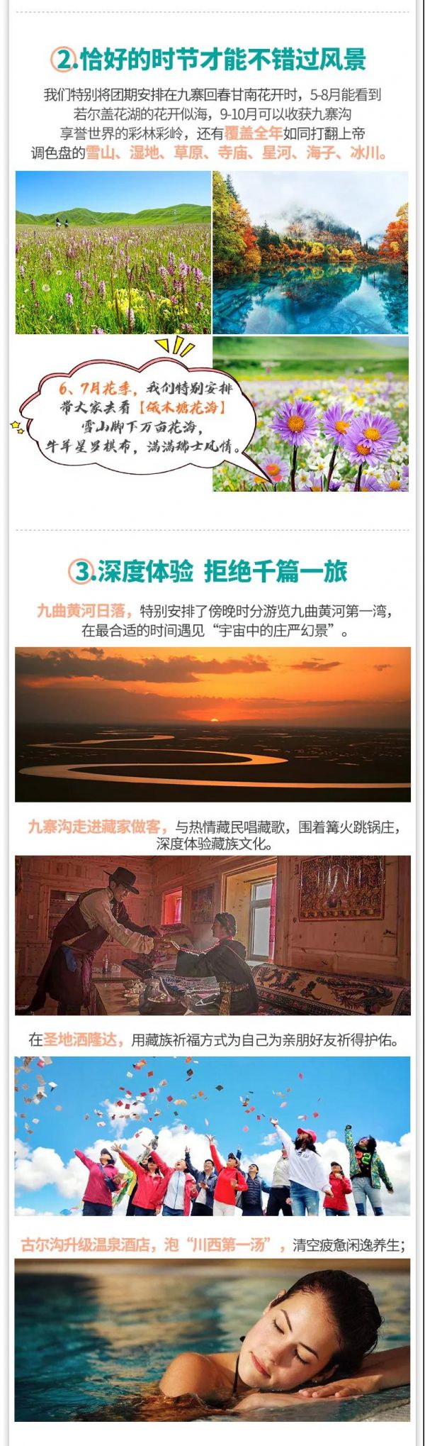 1、門(mén)票:含九寨溝門(mén)票、畢棚溝門(mén)票、若爾蓋花湖門(mén)票、甘肅郎木寺門(mén)票、黃龍門(mén)票、九曲黃河第一灣門(mén)票;(優(yōu)惠及退票請(qǐng)現(xiàn)詢報(bào)名處。)