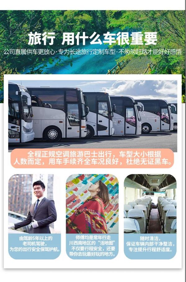 1、關(guān)于車(chē)輛交通:目前四川旅游市場(chǎng)8座以下車(chē)輛無(wú)法辦理旅游牌照,請(qǐng)游客知悉,以此理由提起的投訴我方拒不受理,望您諒解。