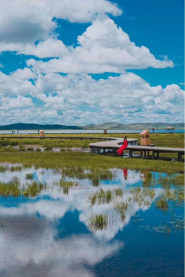 然后我們前往草原湖泊【若爾蓋花湖】,花湖湖面遼闊,水下是深不可測(cè)的沼澤地,在陽(yáng)光的照耀下,水面反射出不同的光彩,攝人心魄。湖邊是大片茂密的蘆葦叢,隨微風(fēng)拂動(dòng),越發(fā)映襯出湖面的寧?kù)o與滄桑。花湖最漂亮的時(shí)候是每年夏天,草地上開(kāi)滿了五顏六色的花朵,極為漂亮。廣闊的草原一片碧綠,藍(lán)色的花湖被一片綠色包圍,仿佛綠色地毯上的一顆藍(lán)寶石,美輪美奐。湖邊建有木質(zhì)棧道,一直延伸到水中,可以沿著棧道走到濕地深處,沿途都可以找到拍大片的好角度?;ê潜姸嘁吧w禽的主要棲息地,湖面上游弋著黃鴨、斑頭雁、天鵝、黑頸鶴等珍稀動(dòng)物,還有高原魚(yú)類和其他珍稀動(dòng)物。坐在湖邊或者棧道上的亭子里,常有黑頸鶴從湖面上掠過(guò)。