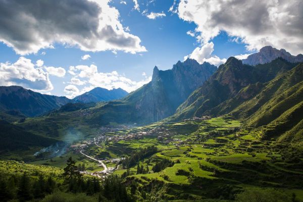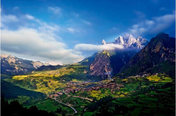 甘肅省迭部縣益哇鄉(xiāng)“扎尕那”是藏語(yǔ),意為“石匣子”扎尕那山位于迭部縣西北34公里處的益哇鄉(xiāng)境內(nèi),是一座完整的天然“石城”俗有“閻王殿”之稱。地形既像一座規(guī)模宏大的巨型宮殿,又似天然巖壁構(gòu)筑的一座完整的古城。正北是巍峨恢弘、雄偉壯觀、璀璨生輝的光蓋山石峰,古稱“石鏡山”因灰白色巖石易反光而有其名;東邊聳峙壁立的俊俏巖壁,凌空入云,云霧繚繞;南邊兩座石峰拔地而起,相峙并立成石門;再南至東哇、納加一帶,峭壁矗立,清流跌宕,水磨飛輪,流轉(zhuǎn)不息。山勢(shì)奇峻、景色優(yōu)美,猶如一座規(guī)模宏大的石頭宮殿,這片世外桃源雖然早在近百年前就被洛克譽(yù)為亞當(dāng)和夏娃的誕生地,但至今仍是一塊處女地。
