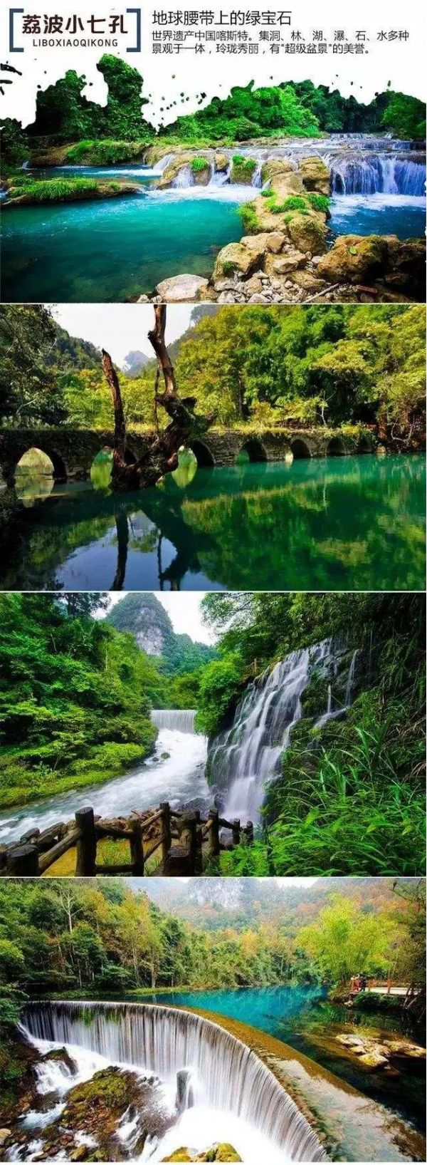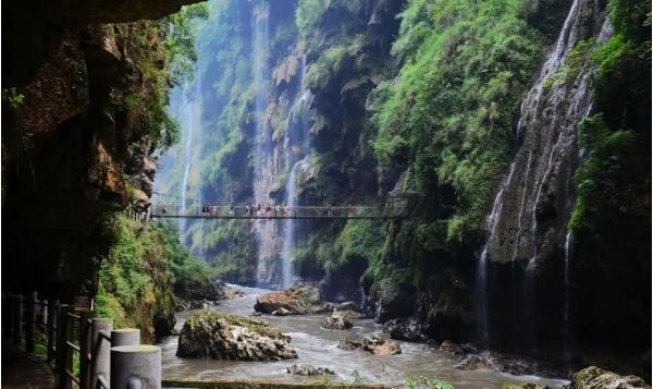 下午:后乘車前往游覽國家 AAAAA 級景區(qū)【大七孔】 (游玩時間不少于 2 小時);大七孔是以原始森林、峽谷、 伏流、地下湖為主體的景區(qū),沿著恐怖峽打狗河直下,可見吊橋,右邊的棧道一面靠山,一邊臨水,蜿蜒曲折,凹凸不 平。最為震撼的還是走過棧道的三分之二處,有一橫跨河兩岸的天然巨巖,是喀斯特是貌奇觀之一,俗稱天生橋,被專 家們譽為 “大自然神力所塑的東方凱旋門”,仰觀橋孔下,只見巨型鐘乳懸掛,橋腳、橋側的裂隙石縫長出綠石草叢灌木,藤蘿花卉纏裹橋身,真是滿目琳瑯、五顏六色的天然大彩橋。