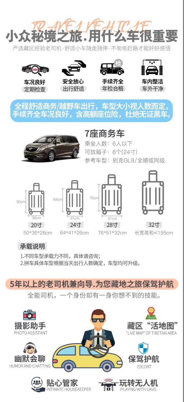 2、交通 :2-6人VIP私享小團,全程舒適越野車/商務車出行,車型大小根據(jù)實際人數(shù)安排,保證一人一正座位,且由駕駛經(jīng)驗豐富的司機為您的出行保駕護航,報價包含車費、油費、停車費、維修費及司機勞務費。