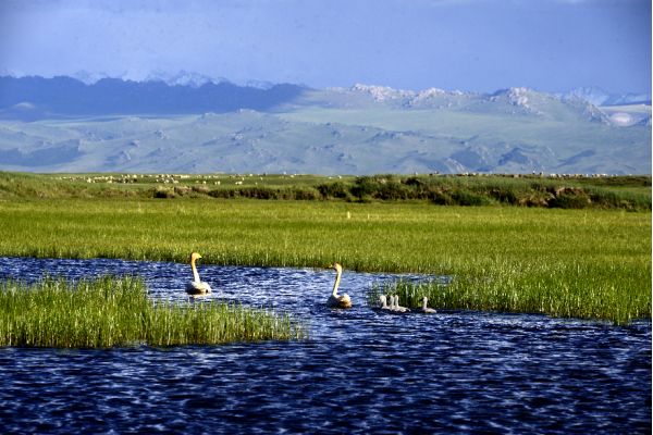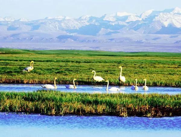 每逢春末夏初,冰雪消融,大地復(fù)蘇,旅居在印度、緬甸、巴基斯坦甚至遠到紅海和地中海沿岸諸國的天鵝和雁鷗,不遠千里成群結(jié)隊地飛到這里筑巢、換羽、求偶、生兒育女、棲息繁衍。這就是我國著名的巴音布魯克天鵝湖自然保護區(qū)。