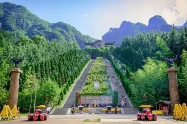 神農(nóng)壇分天、地二壇,依山而建。天壇正中聳立著炎帝神農(nóng)巨型牛首人身雕像。天壇之下為地壇,辟有可容數(shù)千人之眾的廣場。廣場大圓圖案,代表天;圓心處設正方形,代表地,方形圖案中,五彩石分列表示木、火、土、金、水五行。