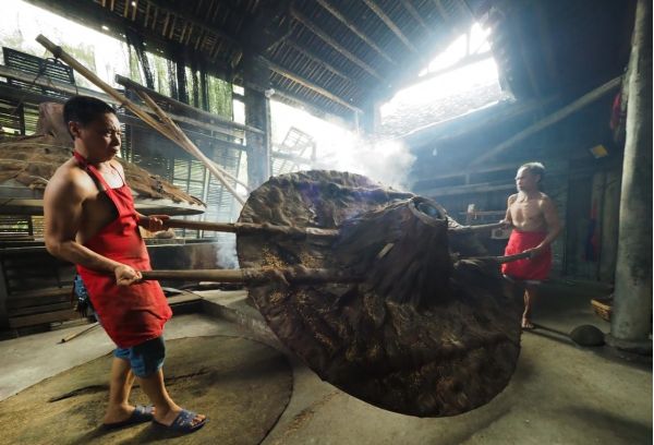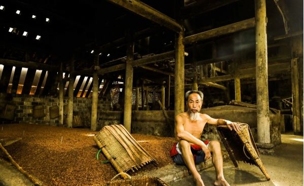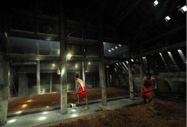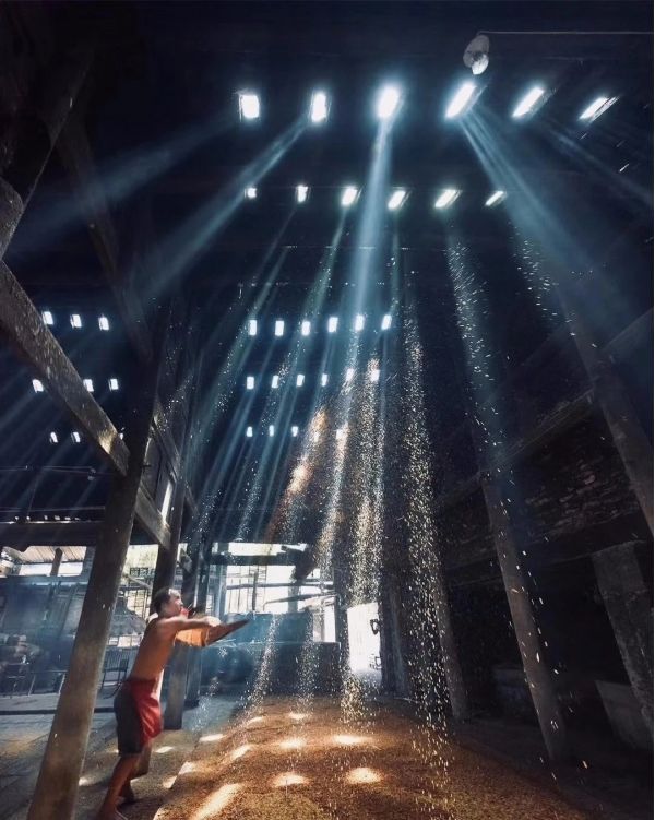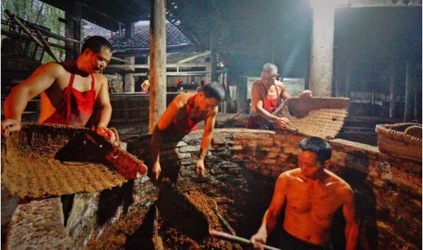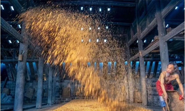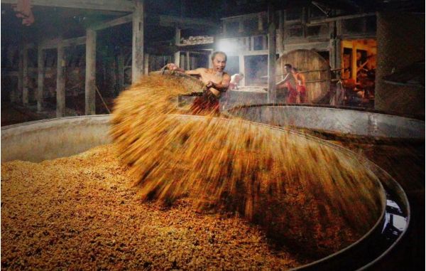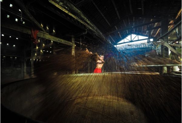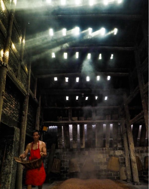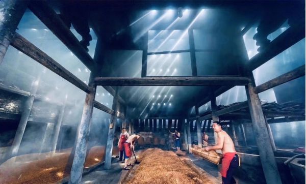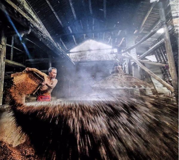 拍攝有著百年歷史的傳統(tǒng)手工藝—泡子酒,迎合著紅高粱霧蒙蒙蒸汽,仿佛置身于行宮騰云般壯觀。烤酒師傅們端著酒糟穿梭行走,或激情揮灑酒曲之間,所到之處,散發(fā)著一種勞動之美,力量之美。將近午時光束穿透老屋頂,投射到古老的作坊,這里便是暈染了熱騰騰的場景。