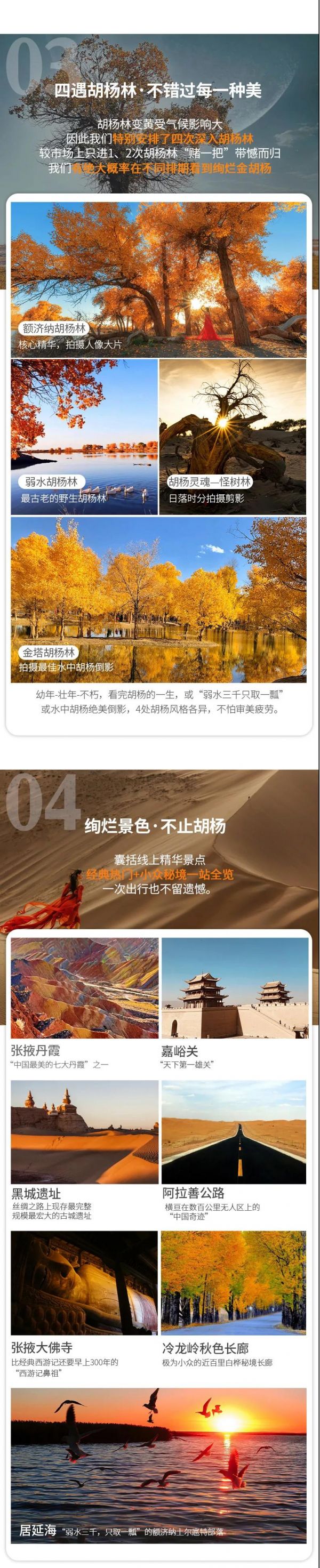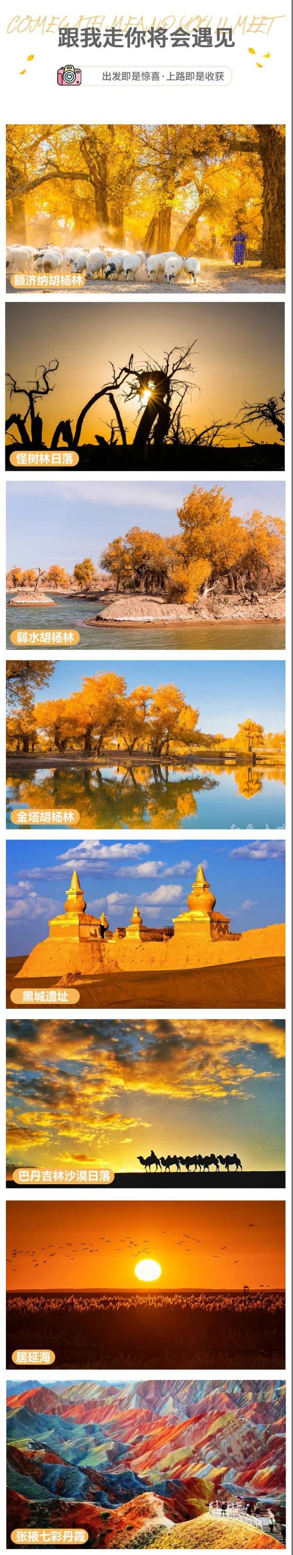 額濟(jì)納胡楊林+冷龍嶺秋色長(zhǎng)廊+金塔胡楊林+弱水胡楊林+怪樹林+七彩丹霞+居延海日出+沙漠日落+張掖大佛寺+嘉峪關(guān)城樓+阿拉善公路+黑城遺址