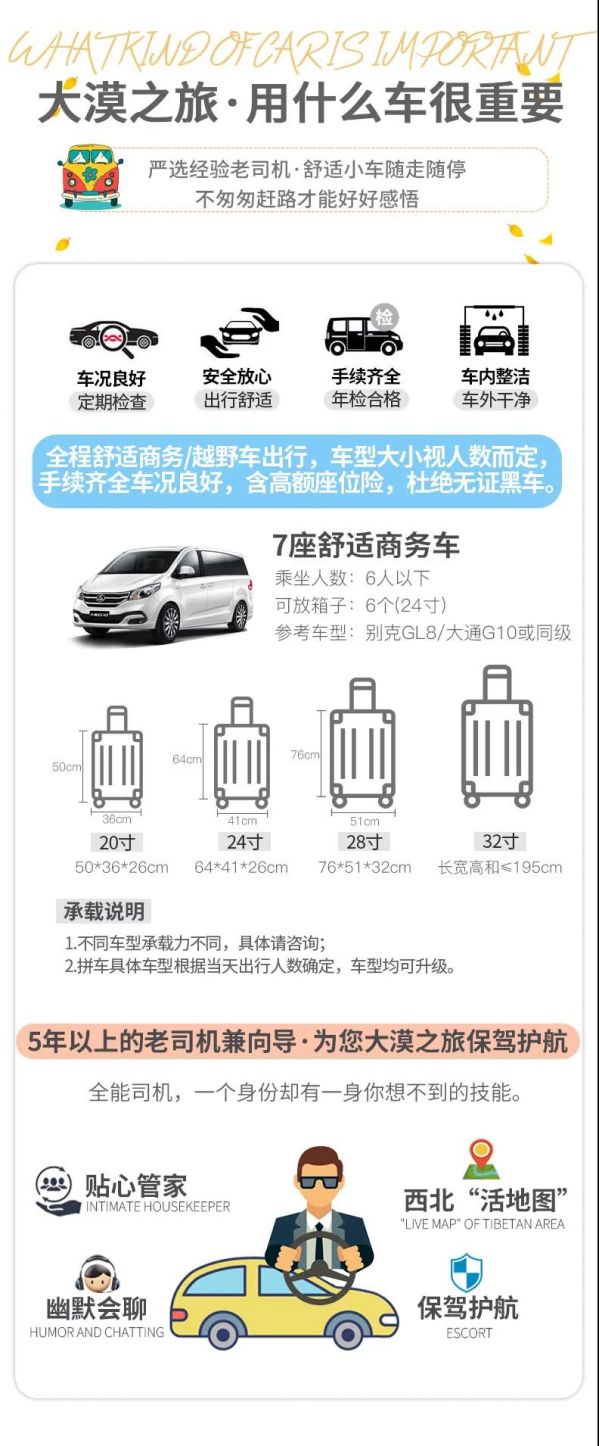 3、贈(zèng)送:貼心禮包戶外百變魔術(shù)頭巾防曬防沙+旅游三寶緩解乘車疲勞+每人每天一瓶礦泉水;贈(zèng)送蘭州市區(qū)接機(jī)/接火車服務(wù)(23點(diǎn)后由于運(yùn)管規(guī)定不能接機(jī)/接站);項(xiàng)目不用不退,望您諒解。