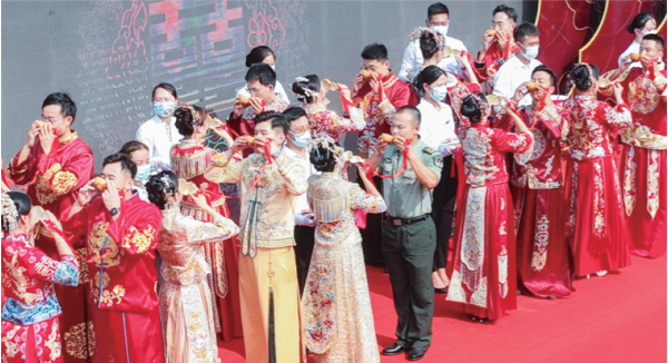 東昌湖畔綠意盎然,風荷映水,10對新人在親朋好友的祝福中,攜手走上紅毯。他們中既有教書育人的園丁,也有守護人們健康的白衣天使,有自由創(chuàng)業(yè)的時代青年,也有保家衛(wèi)國的軍人,他們爭做文明新風的參與者、移風易俗的倡導者?!跋M苡梦覀兊男袆酉驈V大青年和家庭發(fā)出倡議,踐行文明新風尚,勤儉節(jié)約辦婚禮?!毙氯藙⒊蛣㈩伻缯f。