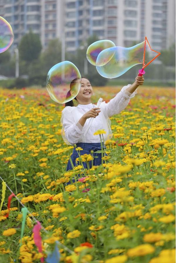 花海中可以看到向日葵、波斯菊、一串紅、步步高、格桑花……陣陣微風(fēng)拂過,散發(fā)著淡淡的清香。