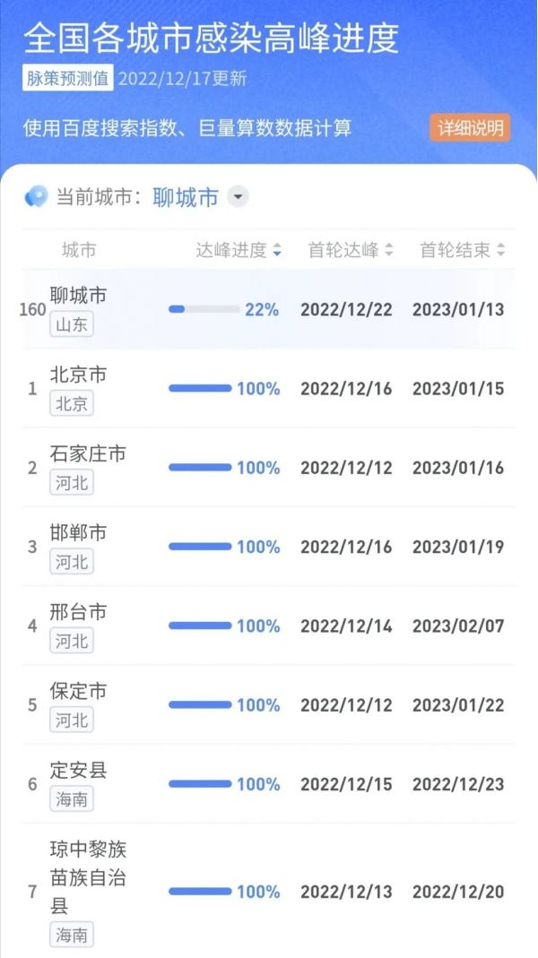 根據(jù)【城市數(shù)據(jù)庫】最新數(shù)據(jù)分析: 2022年12月17日更新 目前聊城感染達峰進度22%