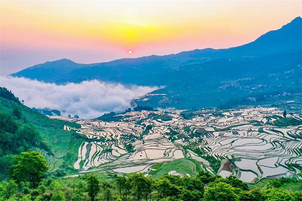 位于元陽縣境內(nèi)的多依樹梯田,是觀看日出的絕佳地點。哀牢山重巒疊嶂,萬畝梯田鑲嵌其中。