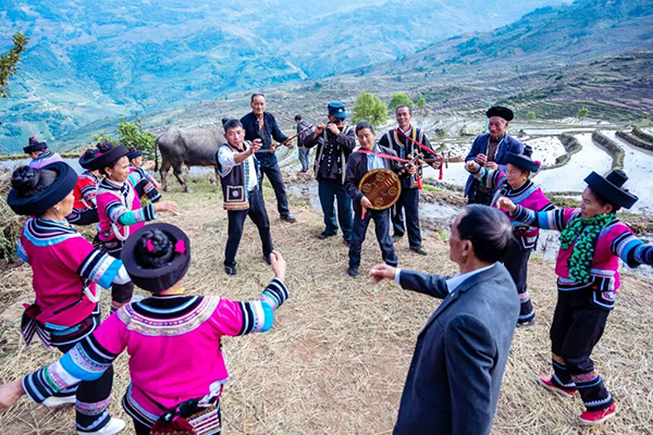 在這里,你可以看非遺傳承人現(xiàn)場刺繡表演,一針一線在指尖穿插,片刻之間,一幅幅刺繡成品呈現(xiàn)在鏡頭面前。也可以和哈尼族人一起穿上民族服裝,在村寨里或者梯田間吹奏著樂器,在鼓聲中翩翩起舞。