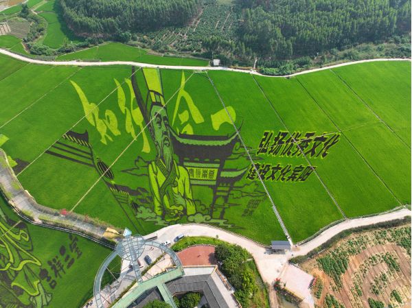 近期,大陸村稻田藝術(shù)景區(qū)迎來(lái)了一批又一批游客。站在觀景臺(tái)上俯瞰,右邊稻田藝術(shù)畫(huà)的主題是“文化賓陽(yáng)”,一幅巨大的明朝思想家王陽(yáng)明像映入眼簾,身后則是“賓州南街”以及“知行合一”四個(gè)大字, 展現(xiàn)了賓陽(yáng)五大文化中的陽(yáng)明文化與古城文化。左邊有兩幅稻田藝術(shù)畫(huà),一幅是“如虎添翼”,一只憨萌可愛(ài)的小老虎背著一雙翅膀,寓意大陸村村民祝愿游客“凡事都能如虎添翼”;另一幅是“吉祥三寶”,畫(huà)面上是烤著串的牛魔王、拿著手機(jī)自拍的鐵扇公主和忙著給爐子添火的紅孩兒,趣味橫生,這是對(duì)“西游”文化的一種趣味解構(gòu)。