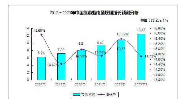 2023年中國旅游市場高速增長,入出境市場平穩(wěn)發(fā)展,供給側結構性改革成效明顯。從2012-2017年旅游行業(yè)數據來看,全國旅游收入保持著兩位數穩(wěn)定增長。2014年全國旅游收入達3.73萬億元,同比增長25.4%,達到近幾年來增速峰值,2015年增幅相對有所放緩。隨著近年來,政府大力發(fā)展全域旅游、冰雪旅游等,2015-2017年中國旅游業(yè)收入增速不斷提高。2018年全國旅游收入將達6.24萬億元,增速約增至15.6%,2023-2028年中國旅游行業(yè)市場深度研究及發(fā)展前景投資可行性分析報告預計到2023年全國旅游收入將達到12.47萬億元 ?