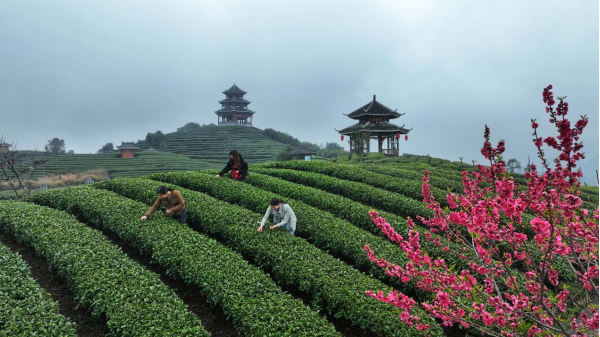 近日,廣西三江侗族自治縣八江鎮(zhèn)布央村仙人山茶園內(nèi)桃花迎春怒放,春茶初露嫩芽,游客愜意采摘,與山上的特色廊亭、縹緲云霧相互映襯,構(gòu)成一幅迷人的春景圖。