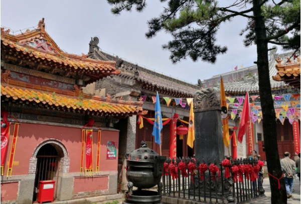 碧霞祠位于岱頂,是泰山女神碧霞元君祠宇,始建于宋大中祥符元年(公元1008年)。祠以山門為界,分內(nèi)外兩院,內(nèi)院正殿供奉碧霞元君銅像,銅瓦覆頂,東西配殿鐵瓦覆蓋。