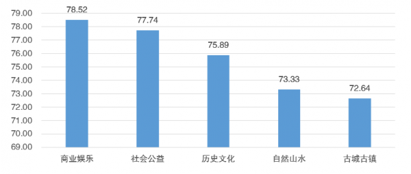 全國318家5A級景區(qū)按照類型可以劃分為歷史文化、商業(yè)娛樂、社會公益、自然山水以及古城古鎮(zhèn)五大類。不同類型的景區(qū)影響力也不同,從統(tǒng)計數(shù)據(jù)來看,商業(yè)娛樂型景區(qū)綜合影響力位列第一,為78.52;其次為社會公益型景區(qū),滿意度為77.74;歷史文化型景區(qū)位居第三,滿意度為75.89??梢娪慰蛯τ谏虡I(yè)娛樂型、社會公益型、歷史文化型的景區(qū)的熱情都比較高漲。