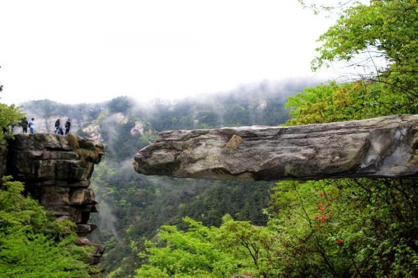 毛主席的七絕詩:“暮色蒼??磩潘?,亂云飛渡仍從容。天生一個仙人洞,無限風光在險峰?!彼鑼懙木褪清\繡谷景色。