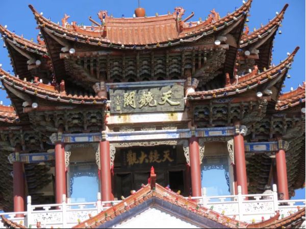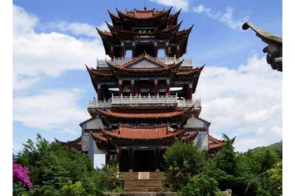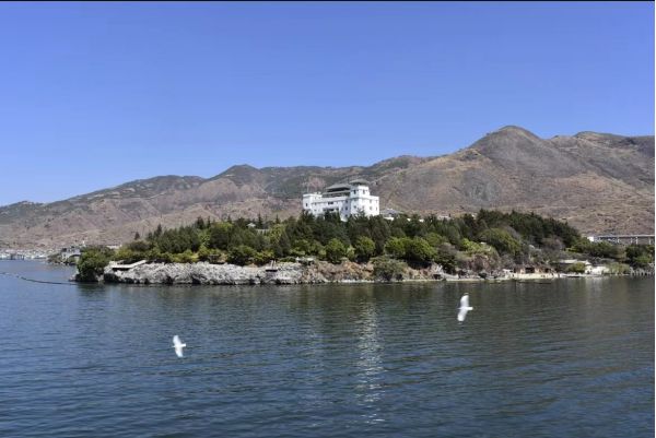 天鏡閣在大理洱海東玉案山上,山勢到這里忽向洱海伸去,三面臨水,懸崖壁立,地勢險要,有山環(huán)吞海,澄海如鏡之勢。