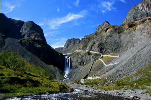 冰涼的河水先是在一段約有600米平緩的地勢里輕歌曼舞般地悠然地散步。緊接著地勢突然向北陡斜,輕緩的河水也立刻情緒沖動起來,暴躁、奔騰、咆哮,一副桀驁不馴的架勢,一路而來跳躍,在距天池約1250米的地方經(jīng)伏牛石巨石的切割,河水改做一大一小的兩股從懸崖上一躍而起,從懸崖峭壁上飛流直下68米,與天然屏障玉壁,金壁相映,恰似兩條玉龍從天而降。飛跌過程中兩條玉龍攪合在一起,水勢更加兇猛,張開大口勇猛地吞噬著突起的石灘,沖向深深的潭底濺起幾丈高的飛浪,十幾丈的水霧,形成了壯美的長白飛瀑。