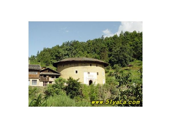 永定土樓分方形土樓和圓形土樓。永定全縣有圓樓360座,方樓4000余座。圓形土樓(又稱圓寨)是客家民居的典范,圓樓大都由二、三圈組成, 由內(nèi)到外,環(huán)環(huán)相套。外圈高十余米,一般高三至四層,有一、二百個房間。一層是廚房和餐房,二層是倉庫,三、四層是臥室;二圈兩層,有三十至五十個房間,一般是客房。中間是祖堂,是居住在樓里幾百人婚喪喜慶的公共場所。樓內(nèi)還有水井、浴室、磨房等設(shè)施。土樓采用當(dāng)?shù)厣梁恢?,不需絲毫鋼筋水泥,墻的基礎(chǔ)寬達三米,可行汽車,底層墻厚1.5米可橫臥人,向上依次縮小,頂層墻厚也不小于0.9米。沿圓形墻用木板分割成眾多的房間,其內(nèi)側(cè)為走廊。