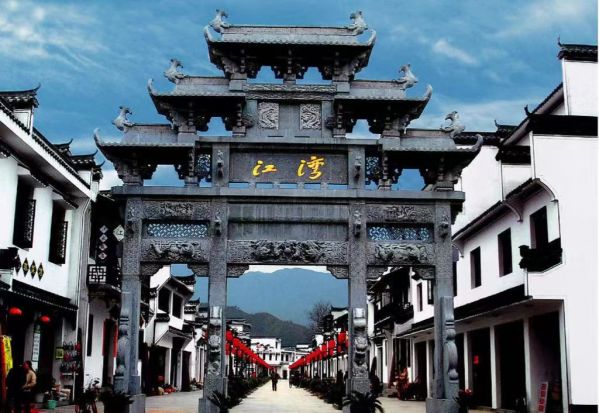 山環(huán)水繞的江灣鎮(zhèn)自然風(fēng)景格外秀美,整個(gè)村子布局規(guī)整,一街六巷,縱橫交錯(cuò)。主街入口佇立著高大巍峨的牌坊,牌坊后的樹(shù)木如士兵般列隊(duì)整齊,走在街上,古樸優(yōu)雅,自成一景。