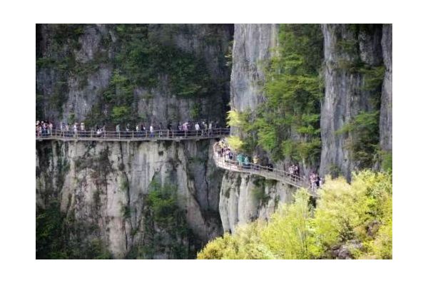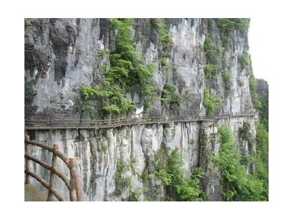 絕壁長廊,又叫“絕壁棧道”,始建于2007年10月,全長488米,118個臺階。位于海拔1700余米、凈高差300余米之絕壁山腰間。該工程既汲取了巴蜀古棧道營造法,又結(jié)合現(xiàn)代鋼筋砼施工之先進工藝,科學安全,凝聚著當代開發(fā)創(chuàng)業(yè)者的勇氣與智慧。沿棧道游覽,一路可以欣賞武陵風光。該棧道共有七道彎八道拐,寓意是:路七彎八拐,心始終如一。歌曰:北斗七星有七斗(dǒu),絕壁棧道有七抖(dǒu);經(jīng)過一番驚嚇后,人生道路手拉手。