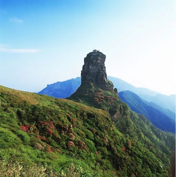 金頂;金頂海拔2494米,是武陵山脈的最高峰。遠眺金頂,恰似農家蒸飯用的甑子,因此黔東一帶諧音把“梵凈山”叫做“飯甑山”。金頂周圍有萬卷書、蘑菇石、老鷹巖、金頂洗手等栩栩如生的奇特景觀,且寺廟甚多。