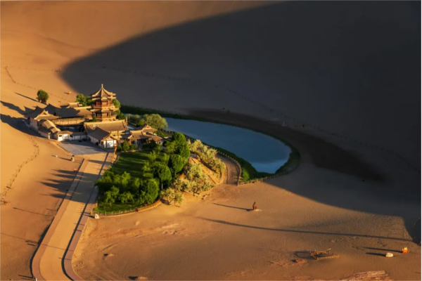 之后我們將前往鳴沙山,【鳴沙山月牙泉】歷來以“沙漠奇觀”著稱于世,是敦煌的名片之一,沙漠與湖泊共生,月牙泉也被稱為沙漠第一泉。大家可以選擇徒步或者騎駱駝上山,從山頂鳥瞰,西域大漠景色讓人心曠神怡,黃沙萬里長,遠(yuǎn)處的駝隊,正悠悠而來;在這里靜待日出東山,大家就可以觀賞到一場壯觀的日出盛宴,當(dāng)那火紅一點一點地從深淵中奮力躍出,直到這輪旭日沖破云層,溫柔卻有力量的晨曦落在鳴沙山起伏的丘陵上,直到染得天地同色,這份似乎要點燃整個西域大漠的壯闊絲毫不遜于“大漠孤煙直,長河落日圓”。