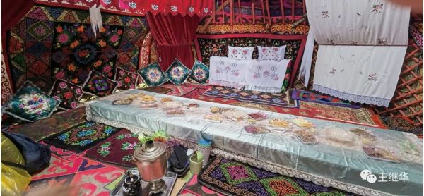 到了可以拍攝的景點(diǎn)主動(dòng)停車,讓我們下去拍攝。山頂?shù)娘L(fēng)光的確要比山下好多了,但是仍然是青山,綠水,今天陰天就看不到藍(lán)天白云了。老張一直游說我們要到山頂蒙古包參觀做客。并給我們糾正這個(gè)不叫在蒙古包,只有在蒙古才叫蒙古包。在哈薩克這叫氈房,漢族叫帳篷。他說你們可以到氈房里去看看,那是哈薩克族的家,到里面參觀拍照都可以。如果消費(fèi),比如說喝牛奶,烤羊串啊等等要花錢。我們到了山頂,在老張的引領(lǐng)下步入氈房。
