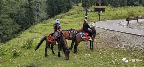有一個(gè)在此休息的導(dǎo)游告訴我們山頂上漂亮可以到山頂上去放無人機(jī),。到山頂有電瓶車票價(jià)120。我們6個(gè)人包了一輛車,司機(jī)叫老張,中等個(gè)風(fēng)吹日曬的黑臉布滿了皺褶。他很熱情主動(dòng)的介紹山上的情況,開車的時(shí)候主動(dòng)問我們新疆第一大民族是什么民族,我們說是哈薩克,他在前面開著車說:錯(cuò)。是維族,他又問第二大民族是什么,我們說哈薩克,他得意的說:還是錯(cuò),是漢族。他又問第三大民族是什么,我們說哈薩克,他說對(duì)了。他又問,你知道那拉提是什么意思,我們說不知道,他說哈薩克語是太陽升起的地方。老張接著自我介紹他也是一個(gè)漢族,今年59歲,家在100公里外的公留縣,老婆是一個(gè)教師,很漂亮。開私家車來這上班,宿舍就在山下公司宿舍。和山上氈房里的哈薩克牧民都非常熟悉。言語之間露出一些自豪。