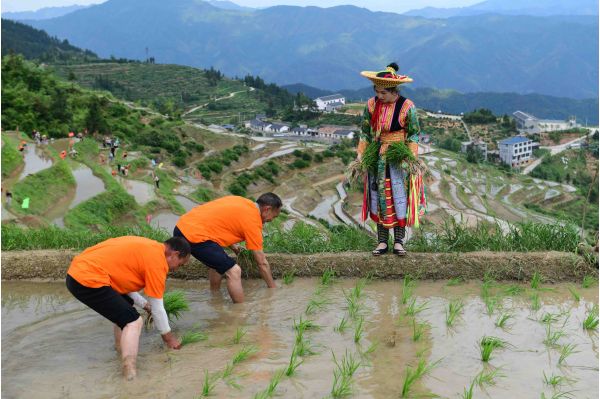 芒種將至,南方的晚稻種植正熱火朝天。5月27日,湖南省懷化市溆浦縣2023年雪峰山山背花瑤梯田插秧節(jié)熱鬧開啟。